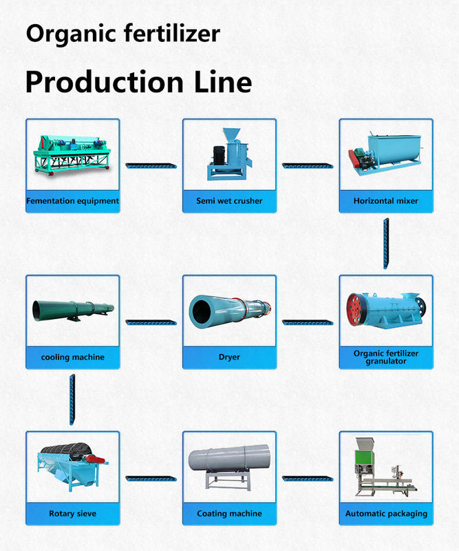 A linha de produção de fertilizantes orgânicos é projetada para granular matérias-primas orgânicas úmidas.,resíduos agrícolas, lixo urbano, etc. O processo de produção do produto inclui esmagamento, mistura, granulação, triagem e embalagem.